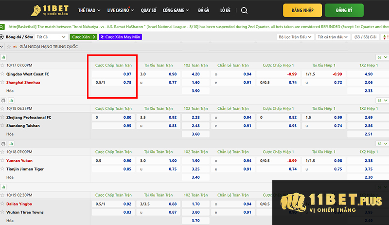 Giả sử, bạn muốn đặt cược kèo chấp toàn trận ¾ trái cho trận Qingdao vs Shanghai. Về phía sảnh cá cược bóng đá 11bet sẽ đưa ra thông tin kèo này là: